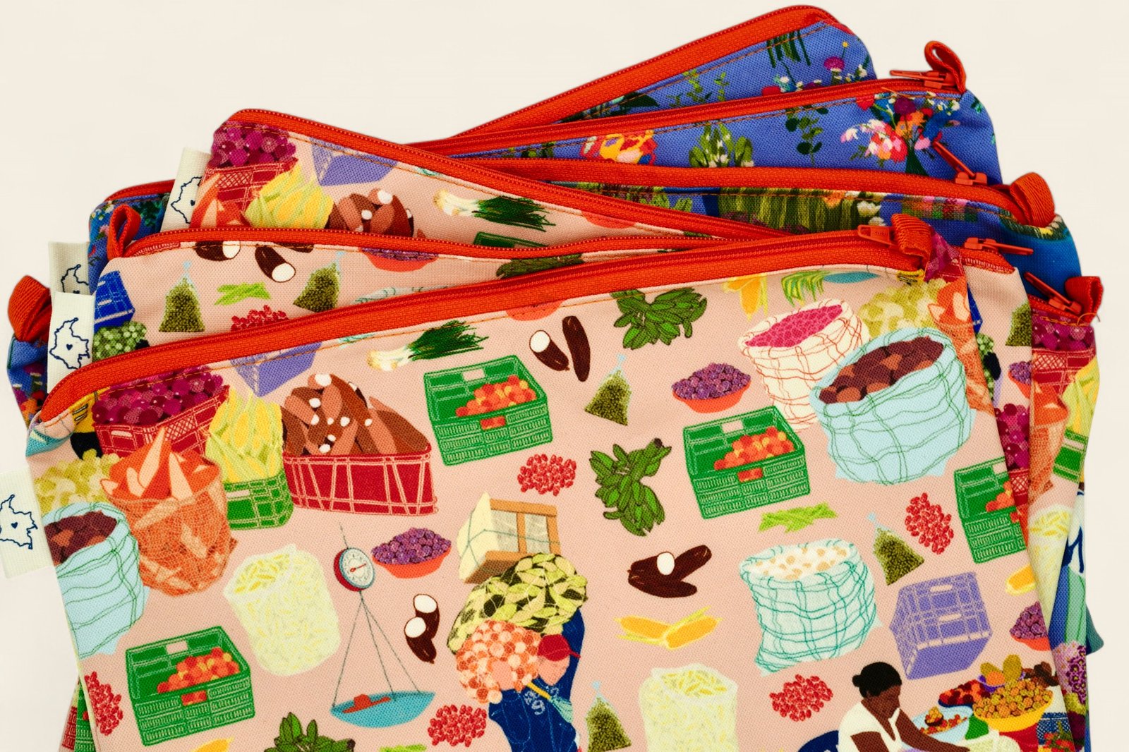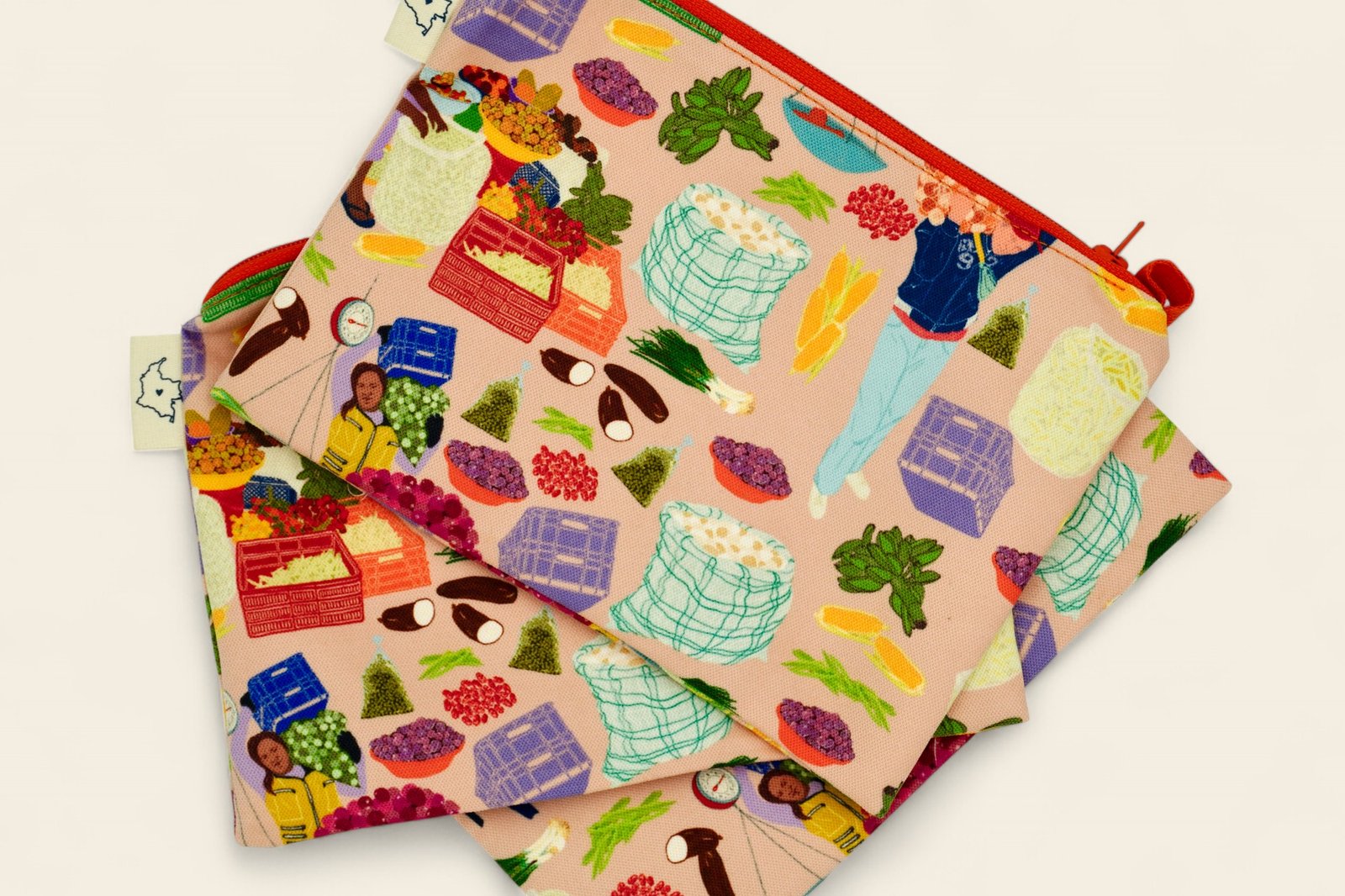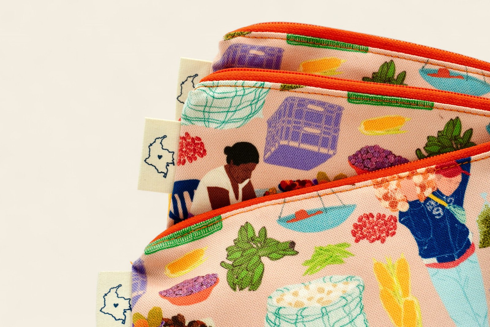 Cartucheras estampadas en imagenes que capturan la esencia vibrante de las plazas de mercado de Colombia