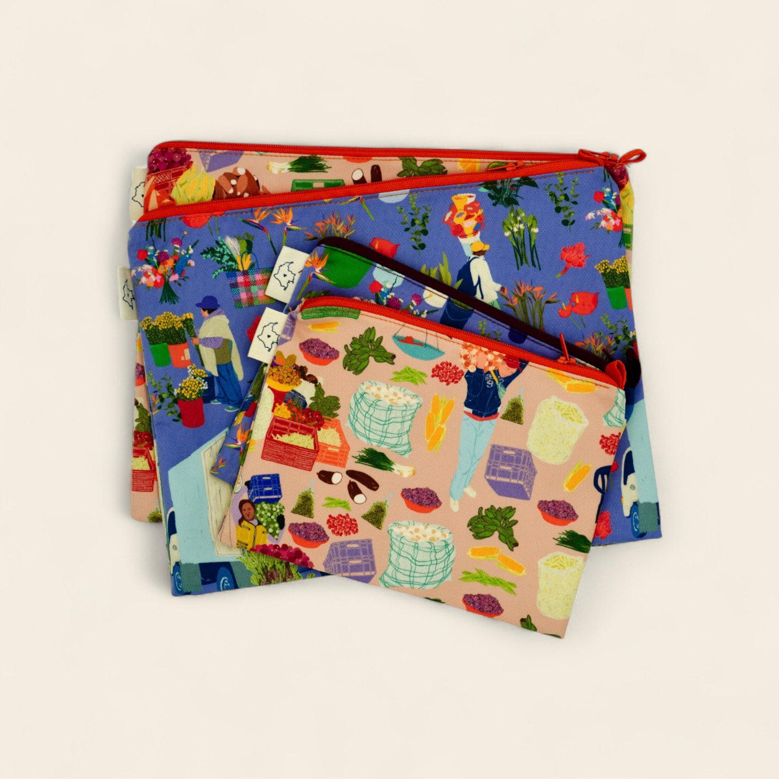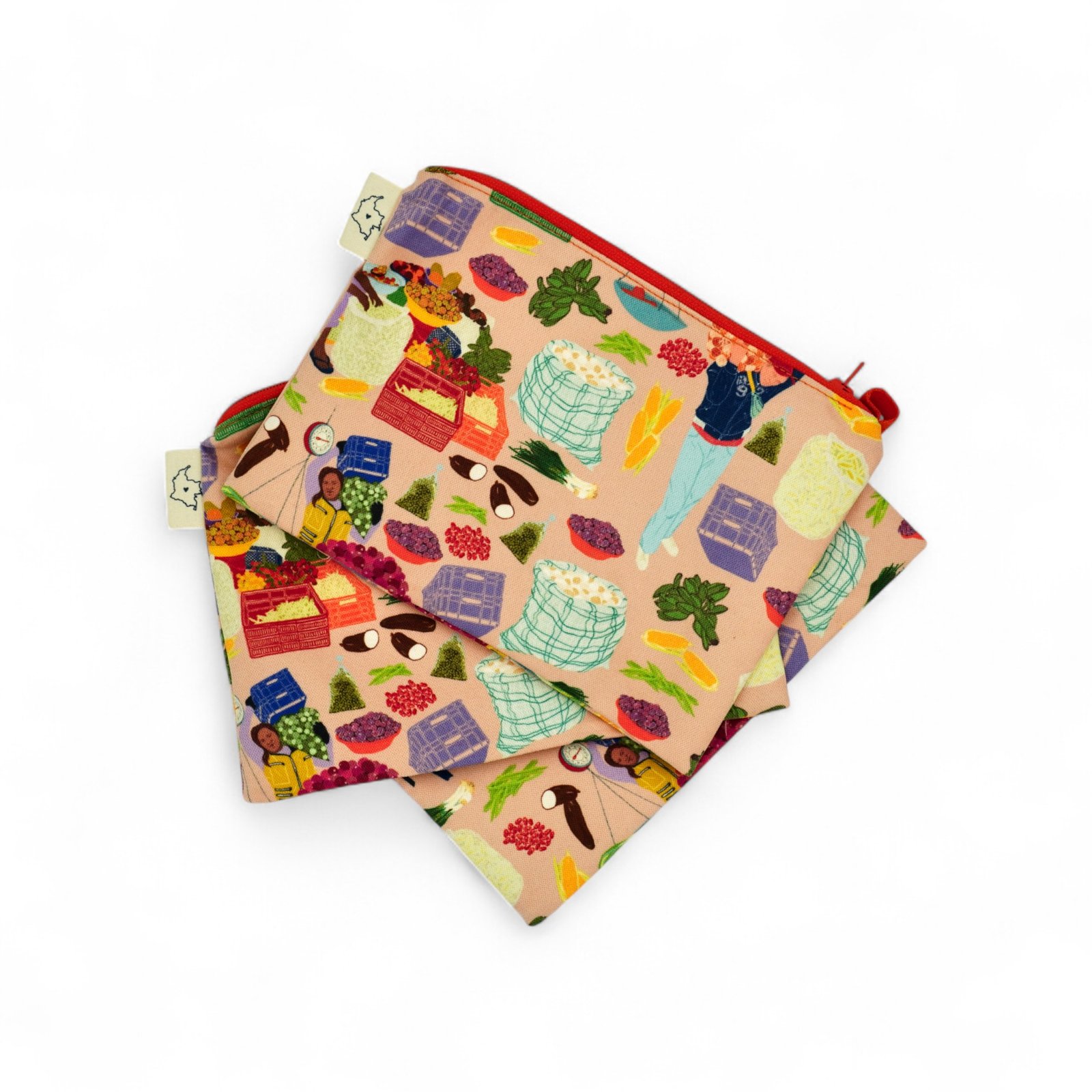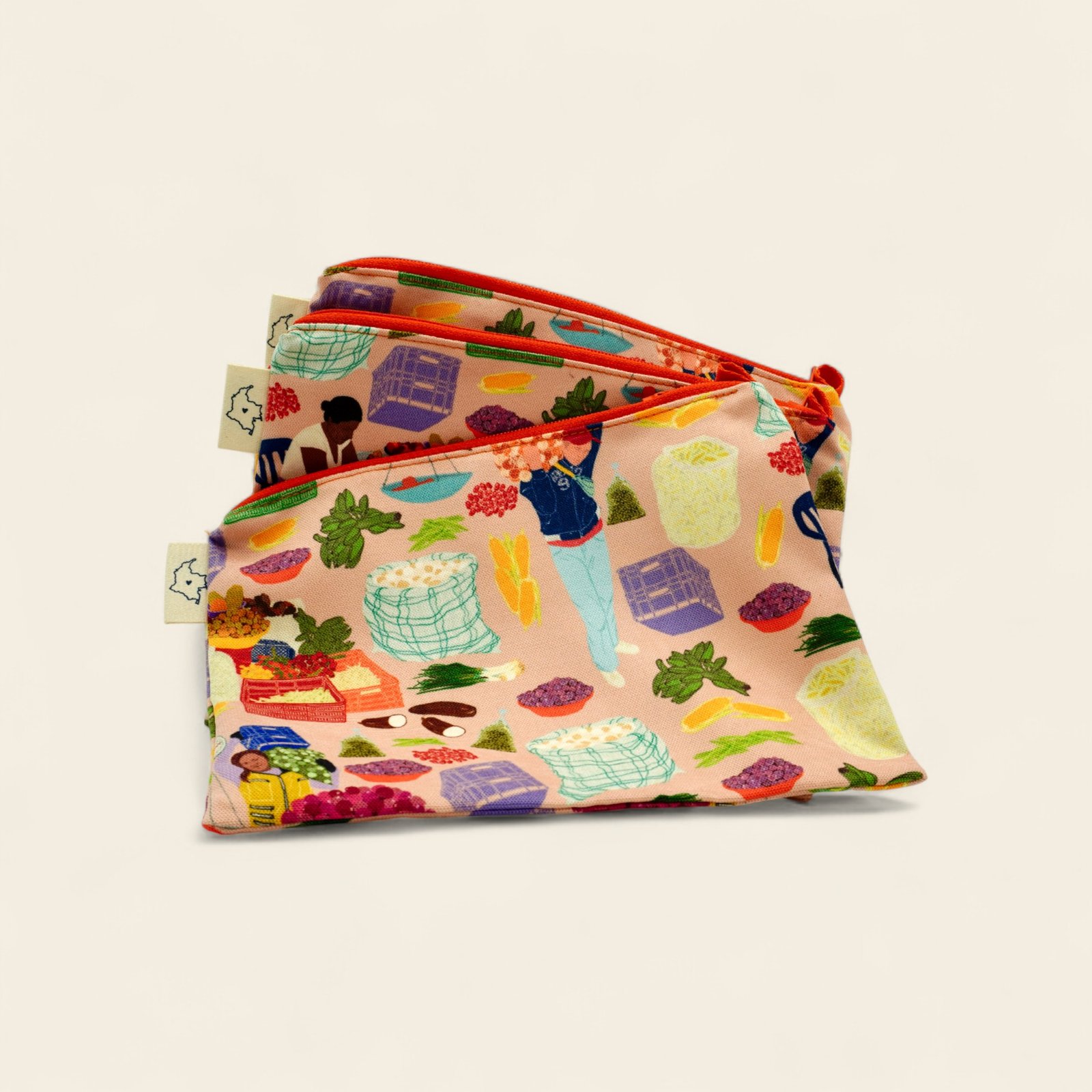 Cartucheras estampadas en imagenes que capturan la esencia vibrante de las plazas de mercado de Colombia