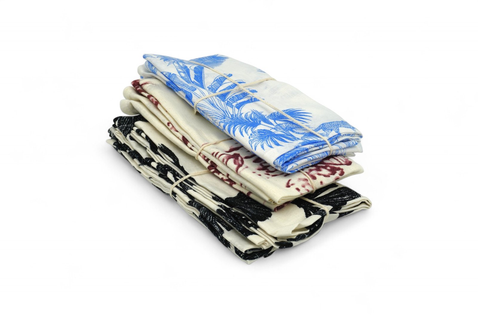 Este juego de 4 servilletas en lino pertenece a la colección Palmas Azules, inspirada en la vegetación tropical y el ritmo pausado de los paisajes colombianos. El diseño presenta ilustraciones de palmas estilizadas en tono azul claro, sobre fondo crudo, que evocan frescura, sombra y movimiento.