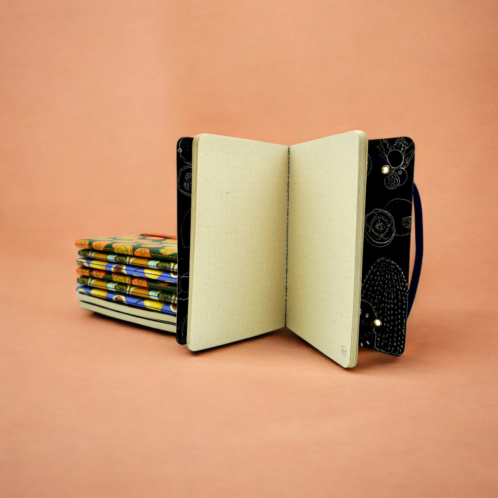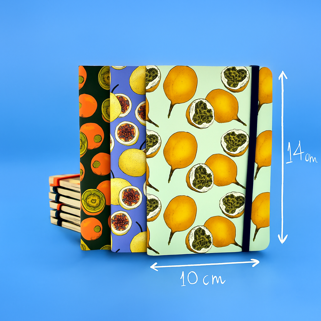 Libreta de bolsillo con cierre de caucho. Carátulas ilustradas con granadillas. Interior con trama de puntos y 128 páginas de papel 100% de caña de azúcar.