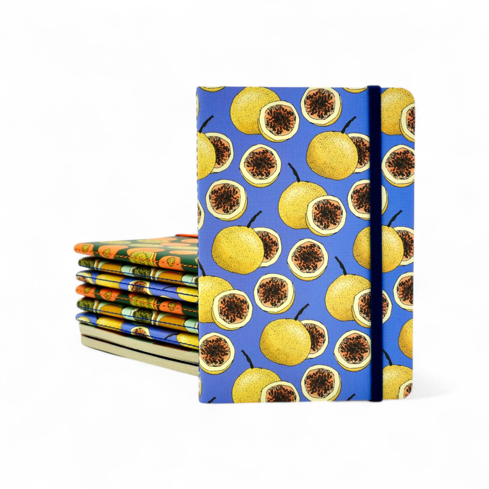 Libreta de bolsillo con cierre de caucho. Carátulas ilustradas con granadillas. Interior con trama de puntos y 128 páginas de papel 100% de caña de azúcar.