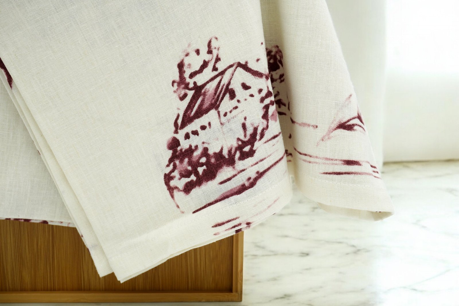 Cada ilustración sobre la tela es un homenaje a la arquitectura vernácula y la memoria cultural del país. El tono morado le aporta un aire sereno y elegante, mientras que el lino conserva la frescura y calidad que lo hacen perfecto tanto para uso diario como para ocasiones especiales.