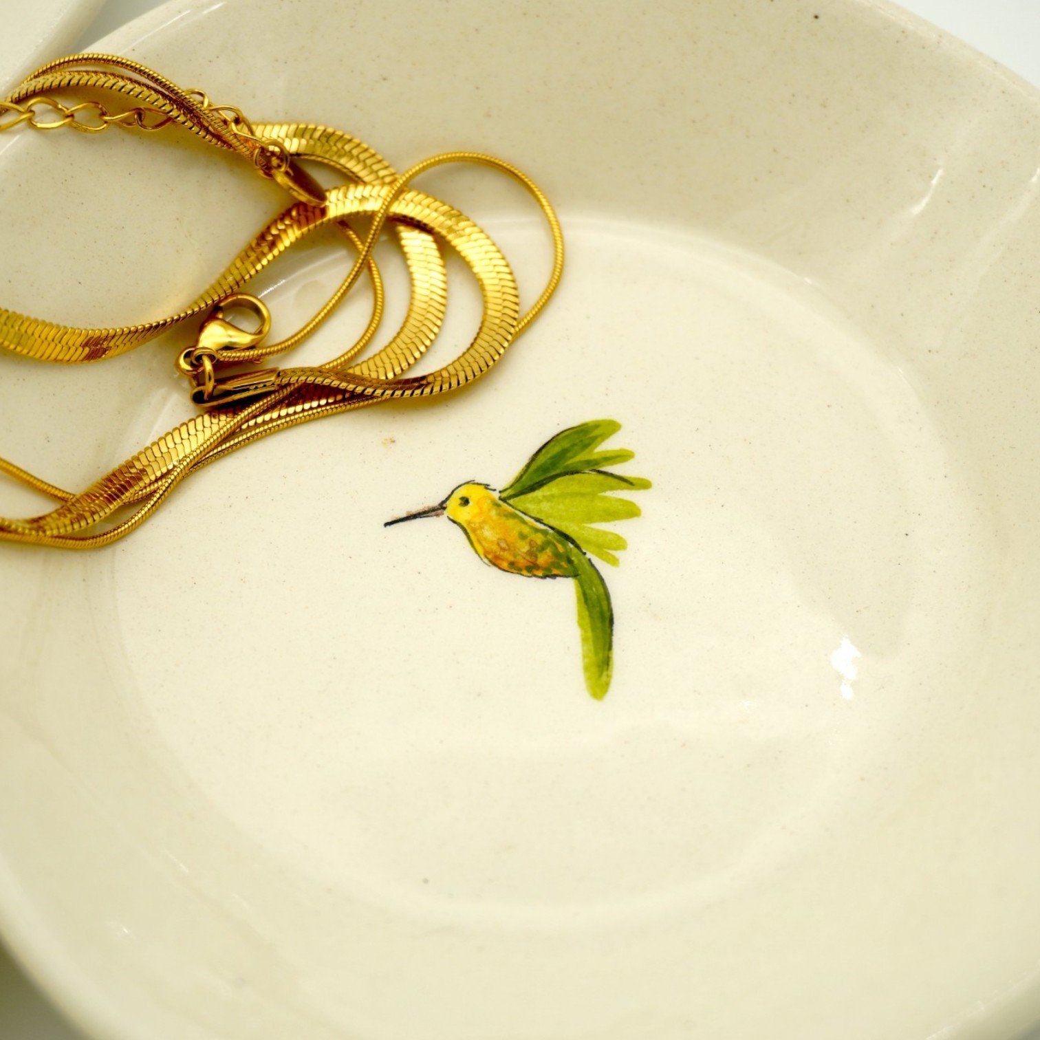 Cada trazo evoca el movimiento delicado y vibrante de estas aves, celebrando la riqueza natural y artística de Colombia. Ideal para guardar anillos, aretes u objetos especiales, esta pieza combina funcionalidad y arte artesanal. Cada platillo es único, reflejo de la biodiversidad colombiana y del valor de lo hecho a mano.