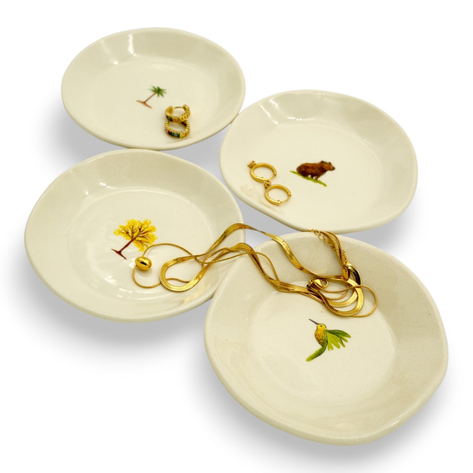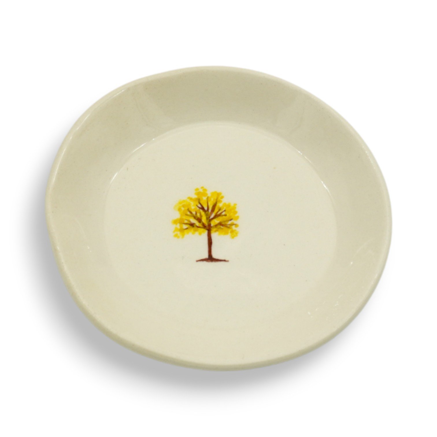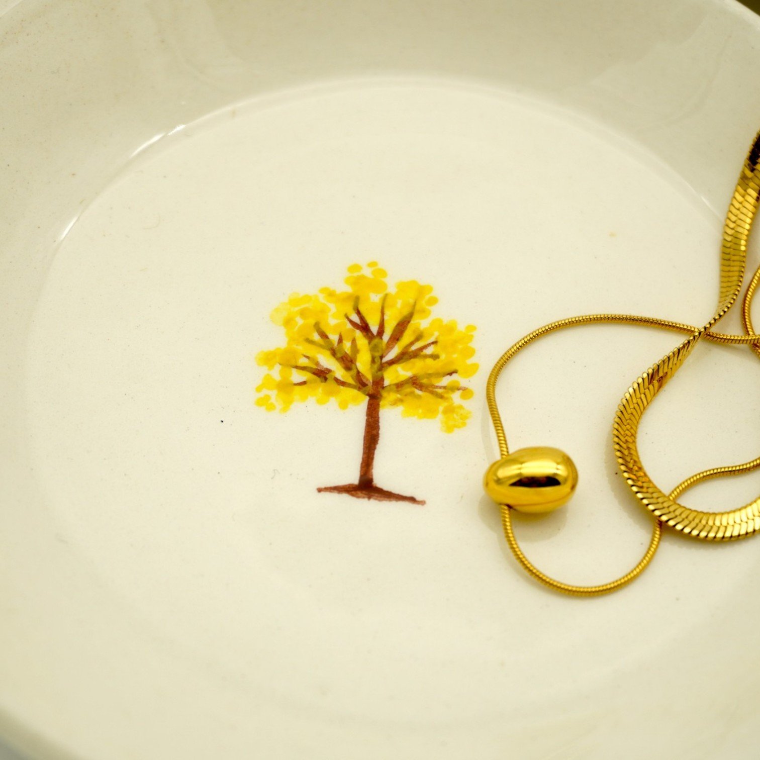 Este platillo decorativo hecho y pintado a mano está inspirado en el guayacán, árbol emblemático de Colombia, reconocido por su floración dorada que transforma los paisajes y anuncia nuevos comienzos. Su presencia simboliza fuerza, esperanza y la belleza que florece en los bosques colombianos.