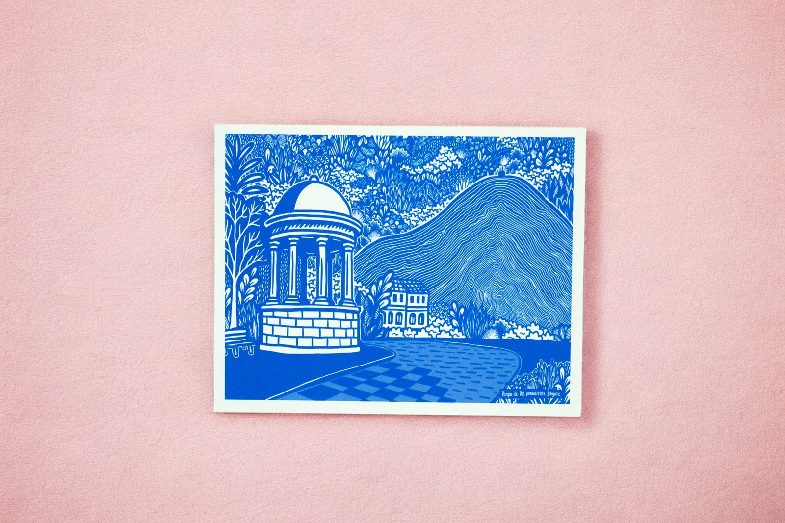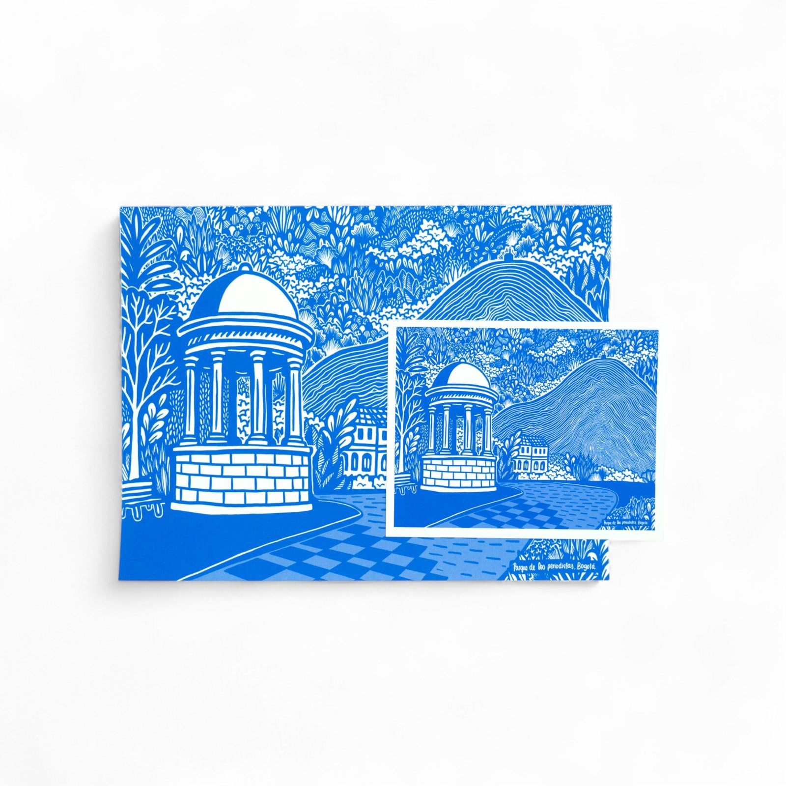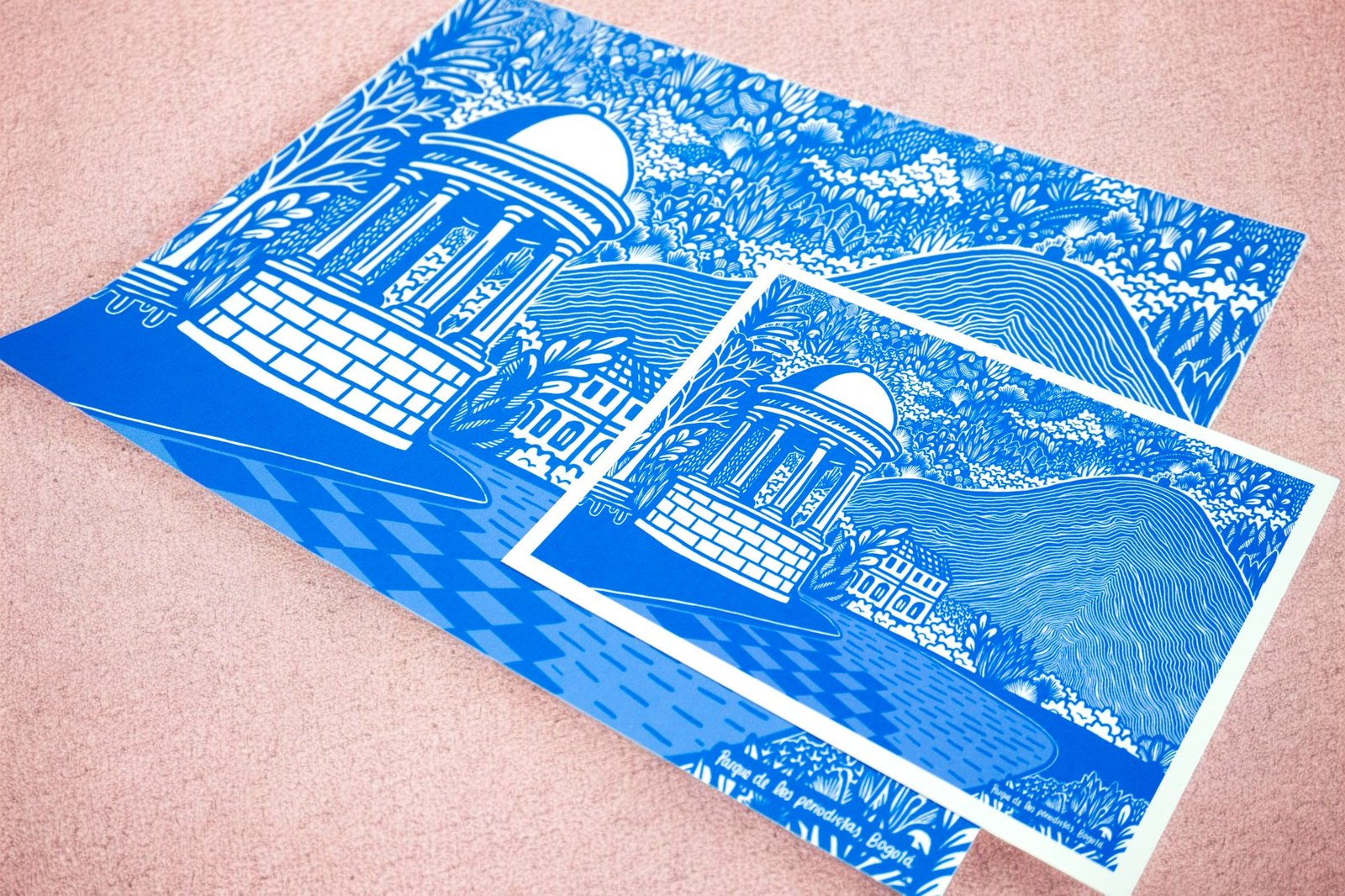 Con líneas fluidas y un solo tono azul, este print retrata el emblemático Parque de los Periodistas, ícono del centro de Bogotá. La artista bogotana emplea un estilo que recuerda la observación científica, pero con una estética orgánica y emocional, propia de su lenguaje visual.