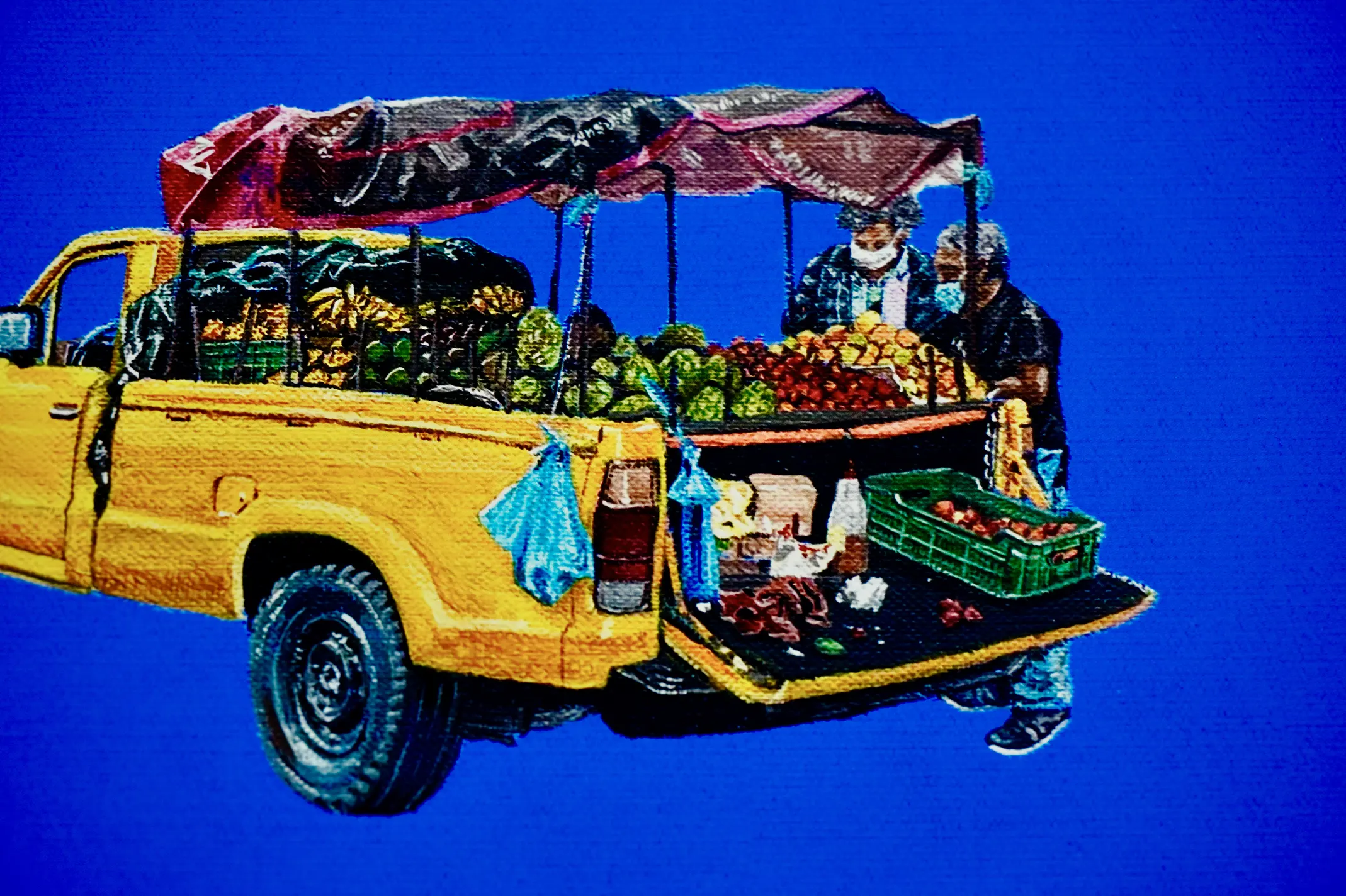 Esta obra está inspirada en una fotografía que tomé en la plaza de Usaquén, pero que se podría encontrar en cualquier calle de Bogotá: una camioneta convertida en un puesto para vender frutas. Hace parte de una serie llamada “¿Quiénes somos? Retrato social” que para mí significó un intento por confrontarnos con nuestra realidad social y generar cuestionamientos sobre aquellas circunstancias y comportamientos en los que nos hemos alejado de nuestro lado más humano y hemos empezado a concebir la miseria, la injusticia y la violencia (en sus diferentes formas) como algo inevitable. Detrás de esta imagen llamativa, existe todo un contexto social, donde hay falta de educación, de oportunidades y mucha desigualdad, y que lleva a muchas personas a tener puestos ambulantes como este, como único medio de subsistencia.