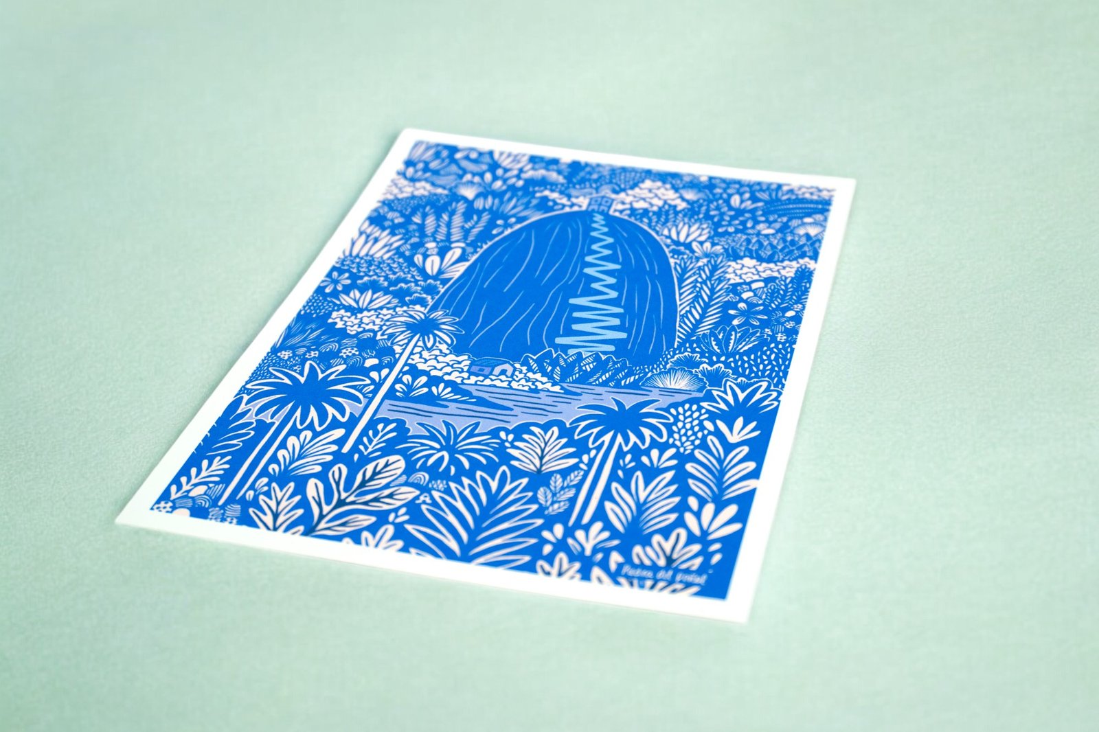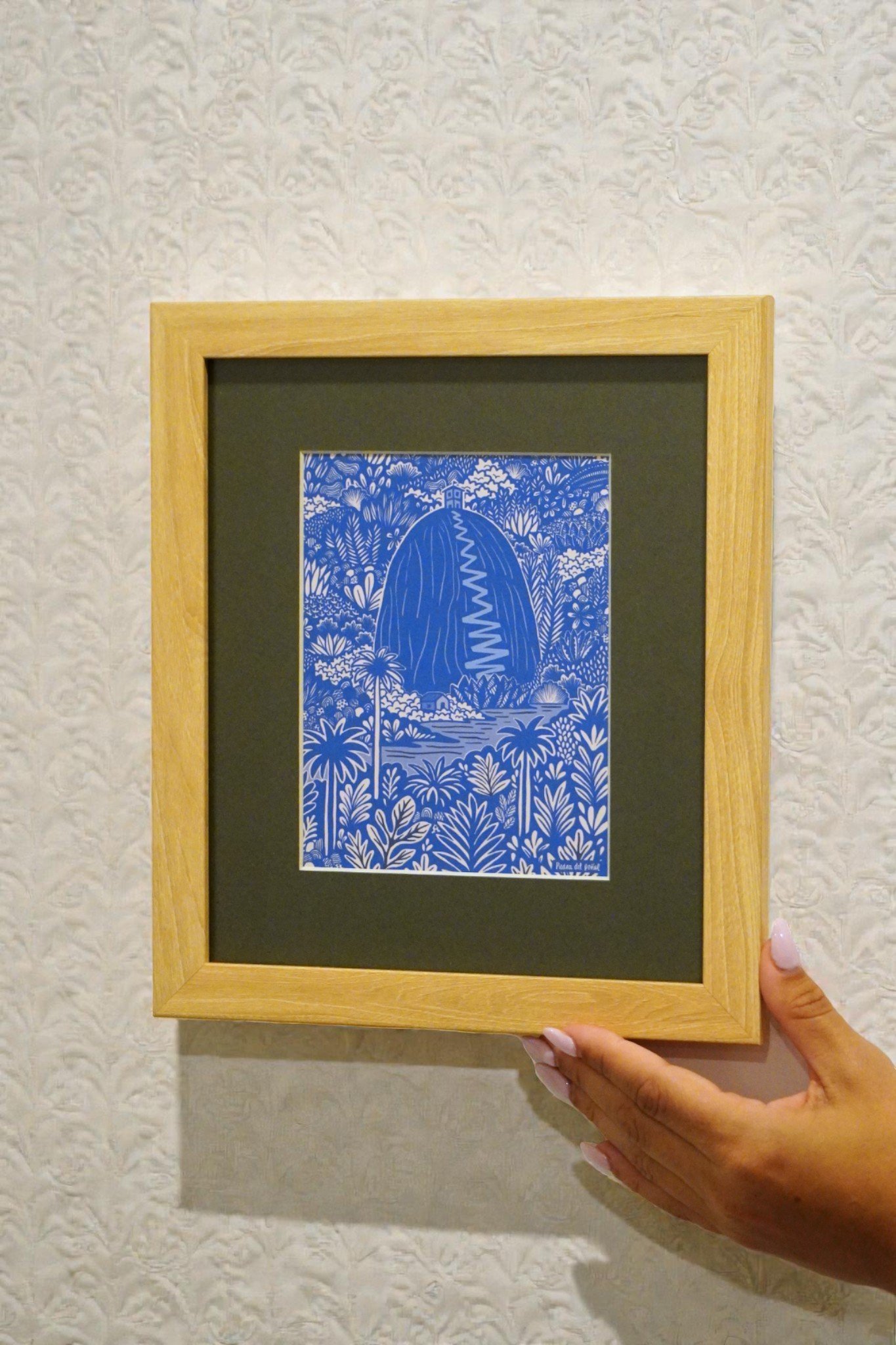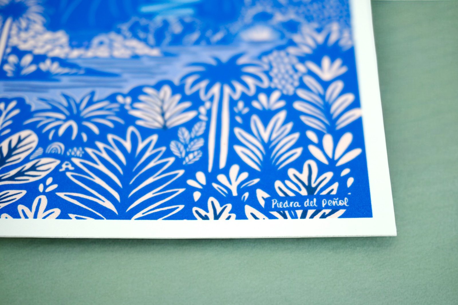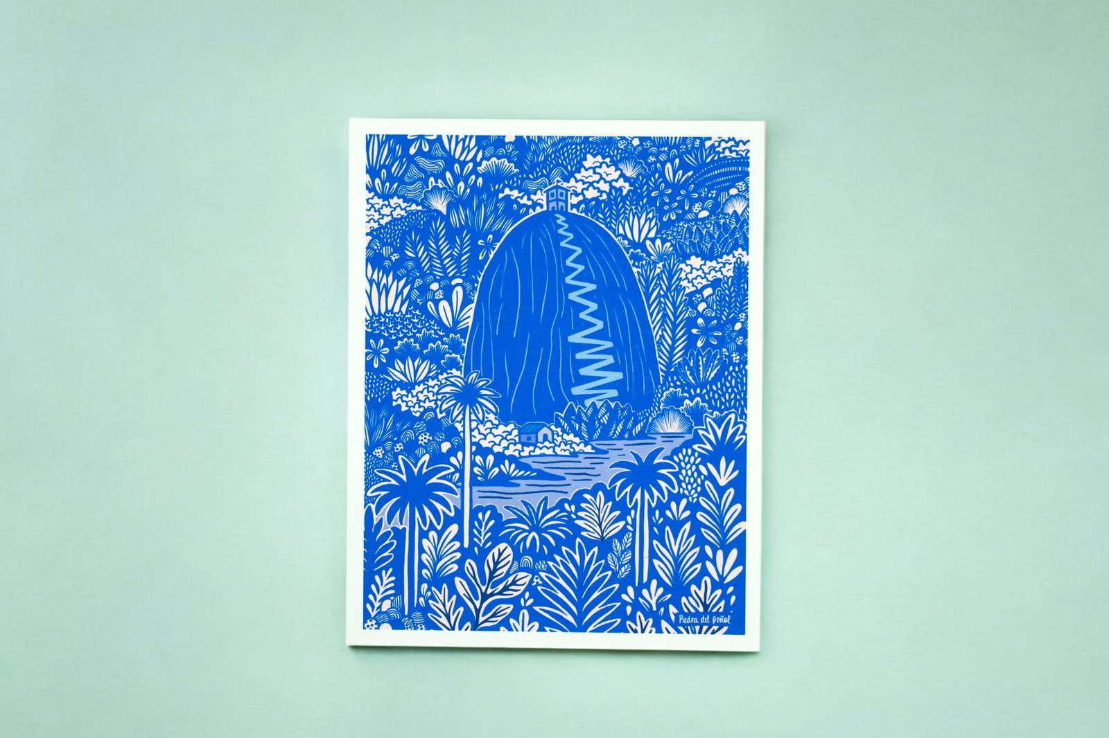 Esta ilustración celebra uno de los íconos más emblemáticos de Colombia: la Piedra del Peñol, ubicada en el oriente antioqueño. Rodeada por una vegetación frondosa que refleja la biodiversidad de la región, esta obra capta la majestuosidad del monolito y su conexión con el entorno. El uso de tonos intensos y un lenguaje gráfico lleno de ritmo y detalle evocan la energía viva de los paisajes antioqueños y el vínculo profundo entre naturaleza y cultura. Un homenaje visual al poder del territorio y a la belleza monumental que habita en Colombia.