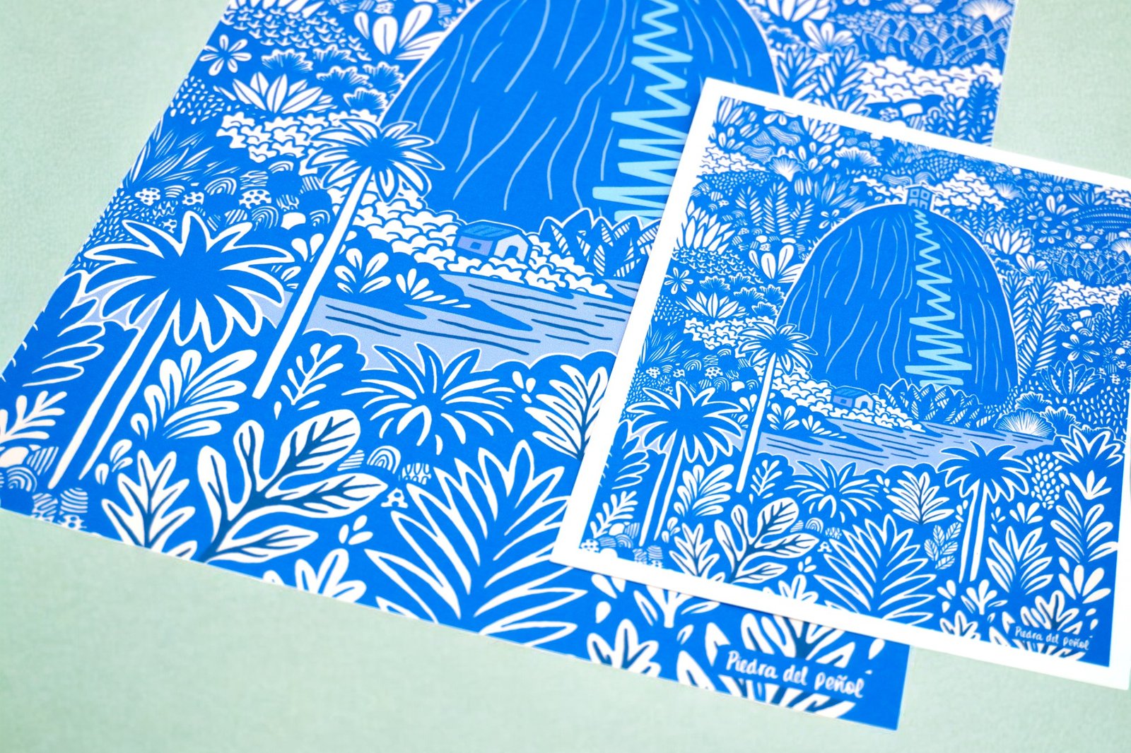 Esta ilustración celebra uno de los íconos más emblemáticos de Colombia: la Piedra del Peñol, ubicada en el oriente antioqueño. Rodeada por una vegetación frondosa que refleja la biodiversidad de la región, esta obra capta la majestuosidad del monolito y su conexión con el entorno. El uso de tonos intensos y un lenguaje gráfico lleno de ritmo y detalle evocan la energía viva de los paisajes antioqueños y el vínculo profundo entre naturaleza y cultura. Un homenaje visual al poder del territorio y a la belleza monumental que habita en Colombia.