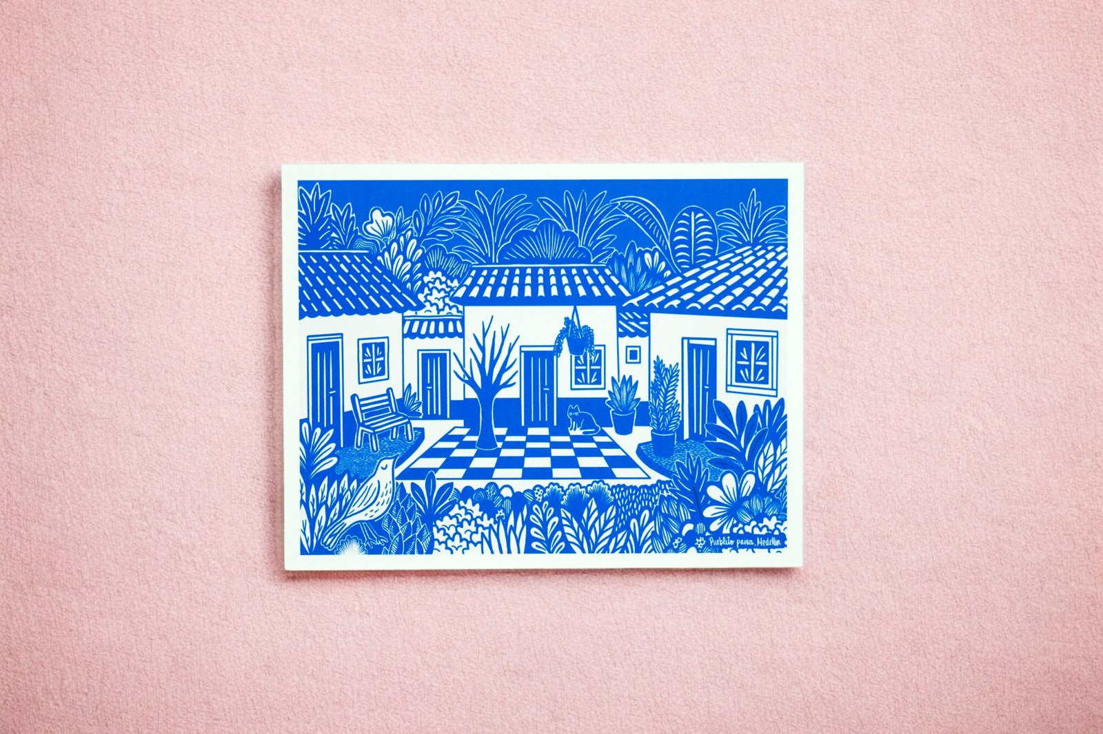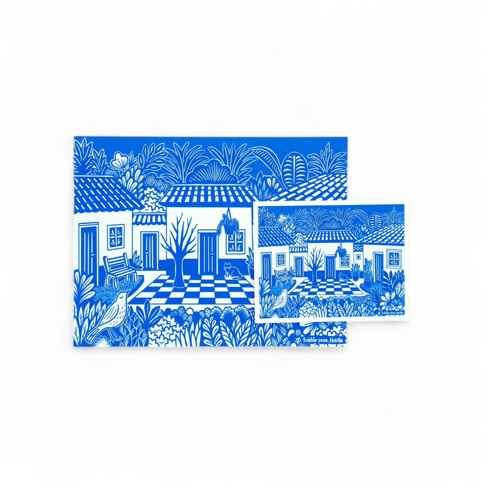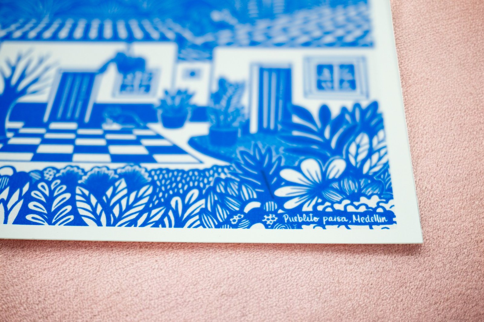 Esta ilustración captura la esencia del Pueblito Paisa, un lugar emblemático en lo alto del Cerro Nutibara, en Medellín. Con su arquitectura de paredes blancas, techos de teja y patios adornados con plantas, este espacio representa la vida pausada, colorida y cercana a la tierra de los pueblos tradicionales de Antioquia. Rodeado por vegetación y habitado por detalles como un gato, un árbol central y aves escondidas entre las hojas, el dibujo transmite calidez y nostalgia. Una escena que rinde homenaje a las raíces rurales y a la belleza cotidiana de la vida en comunidad.
