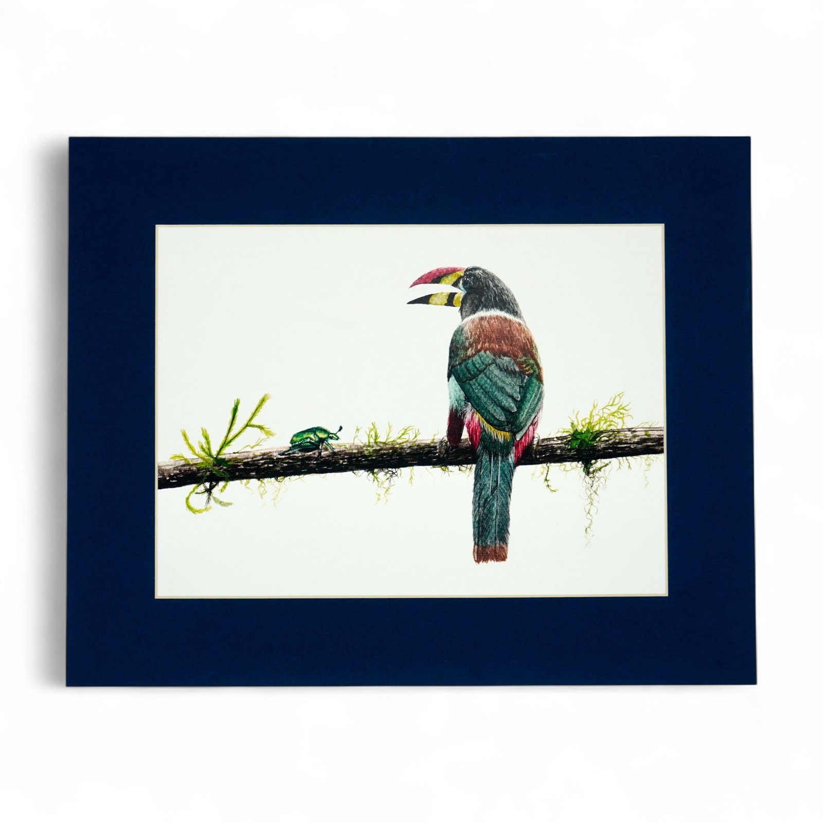 Esta ilustración retrata al tucancillo collarejo junto a un escarabajo, como símbolos de la abundancia y biodiversidad que habita en los bosques colombianos. Inspirada en la tradición ilustrada de la Expedición Botánica, la obra rinde homenaje a esos pequeños y grandes seres —a menudo invisibles— que sostienen la vida de este territorio fértil, sonoro y profundamente vibrante.